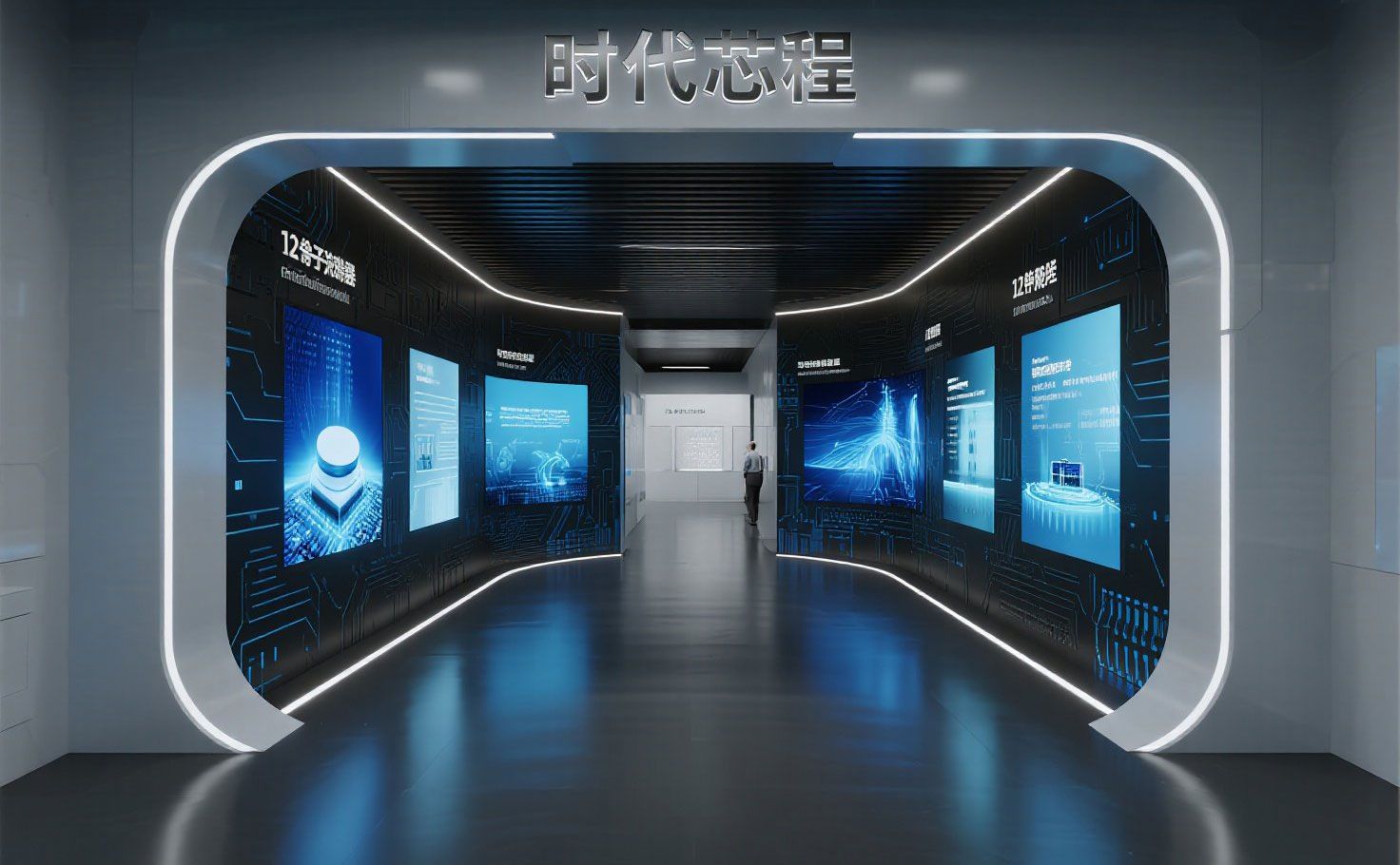 步入時(shí)光隧道,鏡面頂棚與地面線性光帶營造出深邃的時(shí)空感。兩側(cè)屏幕以“電子漂流”的獨(dú)特形式,生動(dòng)描繪從一粒硅砂到尖端芯片的宏大產(chǎn)業(yè)變革史詩。展廳設(shè)計(jì)者精心標(biāo)注的企業(yè)關(guān)鍵里程碑,如同航標(biāo),清晰地勾勒出技術(shù)躍遷的壯闊圖景。這條長廊不僅是歷史的回響,更是整個(gè)電子元件科技展廳對(duì)電子工業(yè)發(fā)展脈絡(luò)的凝練與升華。