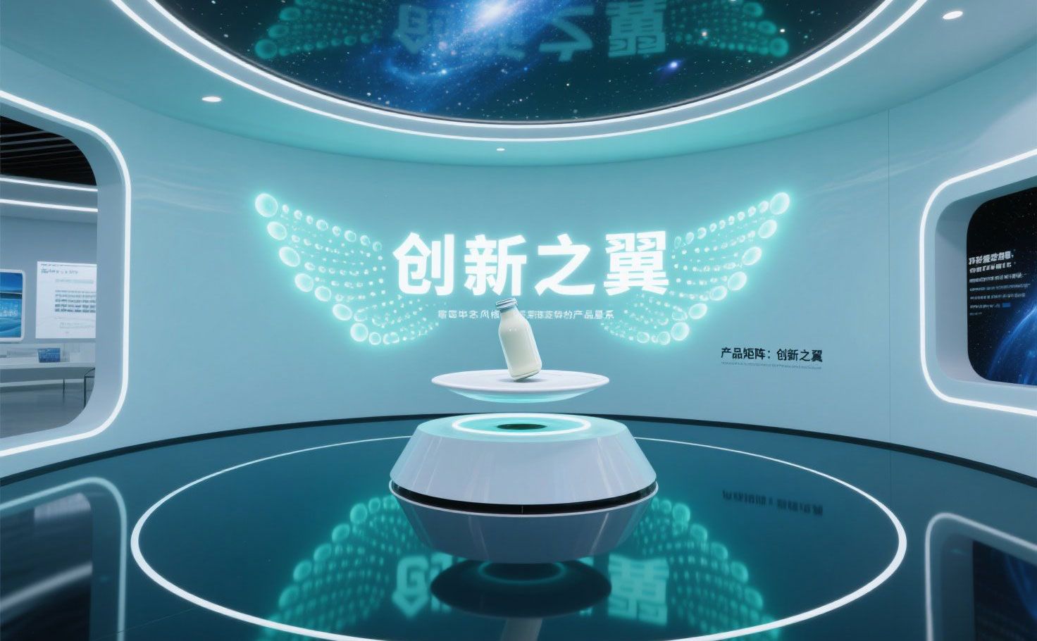 展館設(shè)計(jì)?亮點(diǎn):感應(yīng)地幕觸發(fā)乳浪漣漪,3D企業(yè)LOGO墻背襯光流,開啟 乳制品企業(yè)展廳?的時(shí)空之門