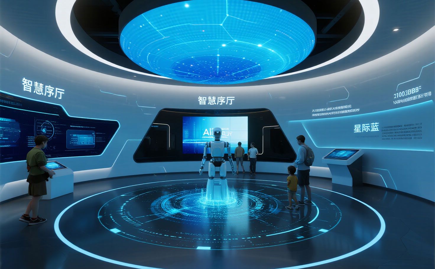 直徑8米星際穹幕以史詩(shī)影像演繹AI技術(shù)簡(jiǎn)史,學(xué)生踏入壓力感應(yīng)地磚即觸發(fā)"數(shù)據(jù)粒子"匯聚——這座由展廳設(shè)計(jì)公司深度定制的中小學(xué)人工智能教育基地,通過學(xué)段自適應(yīng)導(dǎo)覽機(jī)器人(故事化/圖解雙模式),開啟人機(jī)共生啟蒙之旅。