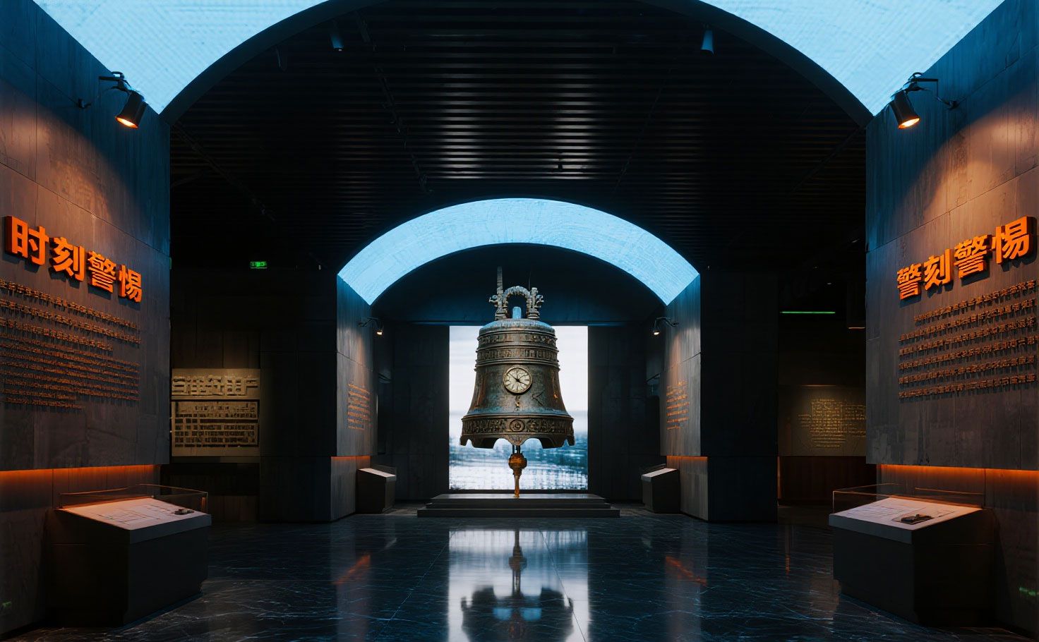 序廳作為整個(gè)鐵路安全警示教育基地的第一印象區(qū)域,占地面積80平方米,以“警鐘長鳴”為核心概念。入口處設(shè)置由破碎鐵軌與散落車輪構(gòu)成的藝術(shù)裝置,還原事故現(xiàn)場,強(qiáng)化視覺沖擊力與肅穆感。中心設(shè)立警鐘造型雕塑,與頂部大型時(shí)鐘聯(lián)動(dòng),傳遞“時(shí)刻警惕”的寓意。兩側(cè)墻面以雕版印刷形式呈現(xiàn)中外安全生產(chǎn)名言,突出安全文化的歷史縱深。