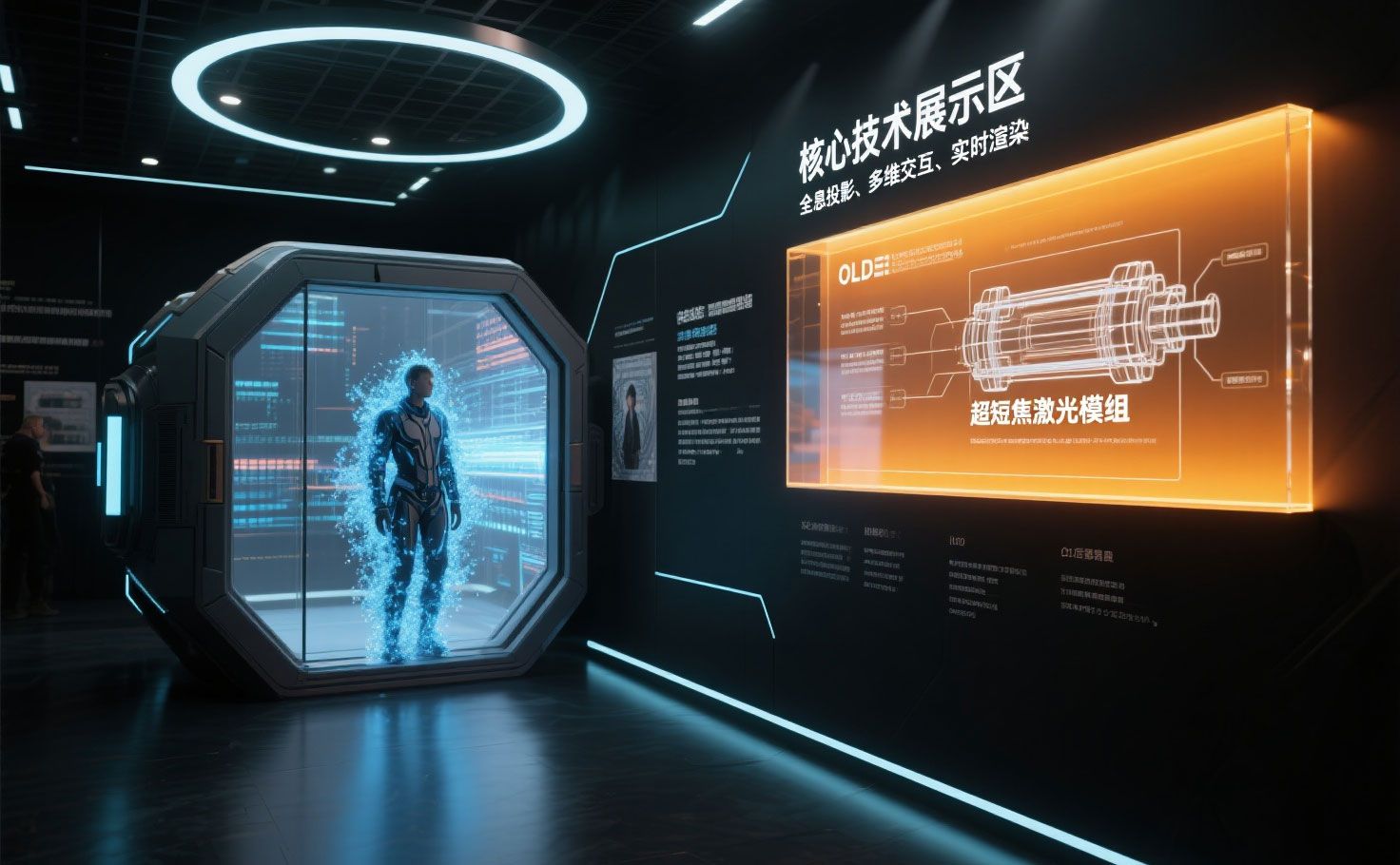本區(qū)集中呈現(xiàn)企業(yè)核心技術(shù)實(shí)力,分為全息投影、多維感官交互與實(shí)時(shí)渲染三大板塊,以“原理-演示-體驗(yàn)”邏輯展開(kāi)。全息區(qū)突出超薄激光模組(3cm)及多規(guī)格設(shè)備矩陣,訪客可進(jìn)入360°全息艙深度沉浸。感官交互區(qū)集成空間音頻、香氛釋放與壓力感應(yīng),通過(guò)“感官交響曲”裝置,使動(dòng)作實(shí)時(shí)觸發(fā)視、聽(tīng)、嗅、觸多維反饋。實(shí)時(shí)渲染區(qū)以裸眼3D“能量魔方”實(shí)時(shí)演示海量數(shù)據(jù)處理,參數(shù)可調(diào),對(duì)比隧道突顯技術(shù)優(yōu)勢(shì)。