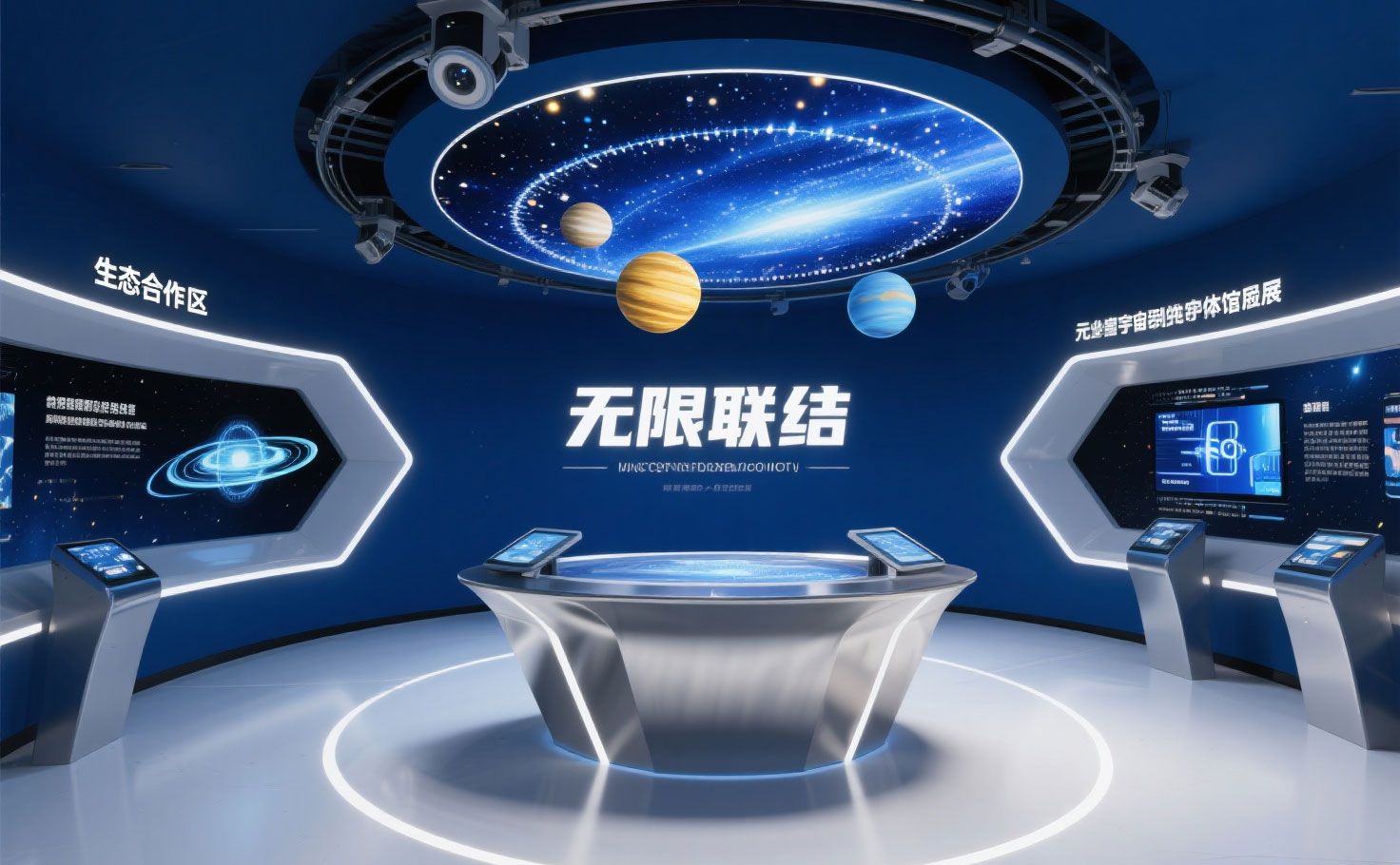 生態(tài)區(qū)以“星辰大海”概念展示合作伙伴網(wǎng)絡(luò),強(qiáng)調(diào)企業(yè)行業(yè)領(lǐng)導(dǎo)力與協(xié)同創(chuàng)新。動(dòng)態(tài)合作墻借磁懸浮技術(shù)使Logo空中懸浮,近距感應(yīng)亮起并顯示信息,觸控可查詳情。周?chē)蠛献髡构窠Y(jié)合實(shí)物與AR標(biāo)注,分領(lǐng)域展示技術(shù)、市場(chǎng)、研發(fā)等案例與成果。中央裸眼3D全息簽約臺(tái)用于虛擬簽約與遠(yuǎn)程協(xié)作,實(shí)用與展示并存。合作查詢(xún)系統(tǒng)依訪客背景提供定制方案并可提交意向,實(shí)現(xiàn)展銷(xiāo)轉(zhuǎn)化一體。作為專(zhuān)注企業(yè)展館的展廳設(shè)計(jì)公司,我們以此區(qū)傳遞開(kāi)放共贏理念。