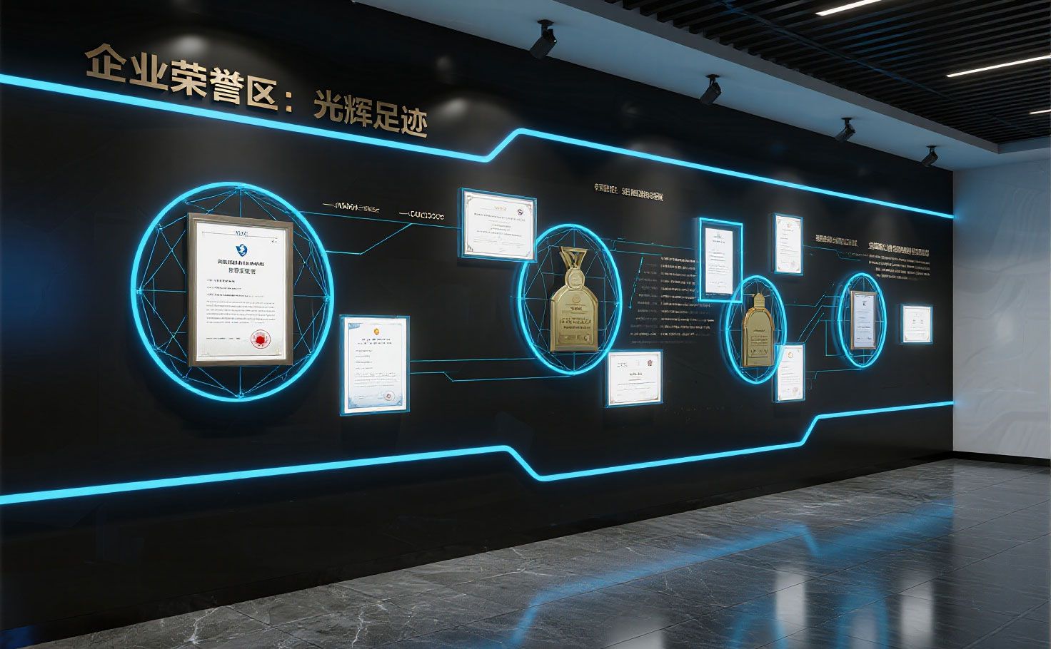企業(yè)榮譽(yù)區(qū)以藝術(shù)化手法呈現(xiàn)企業(yè)獎(jiǎng)項(xiàng)、專(zhuān)利與里程碑,打破傳統(tǒng)陳列方式。入口創(chuàng)新時(shí)間軸墻將企業(yè)發(fā)展與行業(yè)、社會(huì)大事關(guān)聯(lián)展示。懸浮獎(jiǎng)牌陣列搭配感應(yīng)解說(shuō),重要獎(jiǎng)項(xiàng)配有團(tuán)隊(duì)采訪視頻,講述創(chuàng)新故事。專(zhuān)利技術(shù)墻動(dòng)態(tài)展示核心技術(shù)脈絡(luò),可交互查看詳情。員工貢獻(xiàn)墻以抽象光影符號(hào)表彰杰出團(tuán)隊(duì)與個(gè)人,兼顧藝術(shù)與隱私,傳遞企業(yè)以人為本的價(jià)值觀。