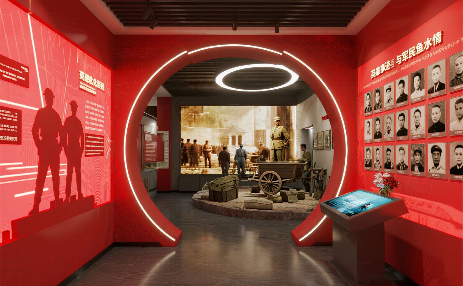 紅色資源區(qū)以英雄事跡與軍民魚水情為核心,是國防教育基地進行情感教育的重要空間。入口為激光交織的紅色基因通道,投影英雄剪影與語錄。中心環(huán)形沉浸式劇場通過360度環(huán)幕與全息技術還原英雄事跡,營造面對面震撼感?;佑⑿蹓牲c擊查看事跡,并獻上虛擬鮮花與感言。后方復原軍民團結場景,結合投影動態(tài)展示群眾支前故事,并設置“送軍糧”、“救傷員”等體感互動項目,深刻詮釋軍民一家的深情厚誼。