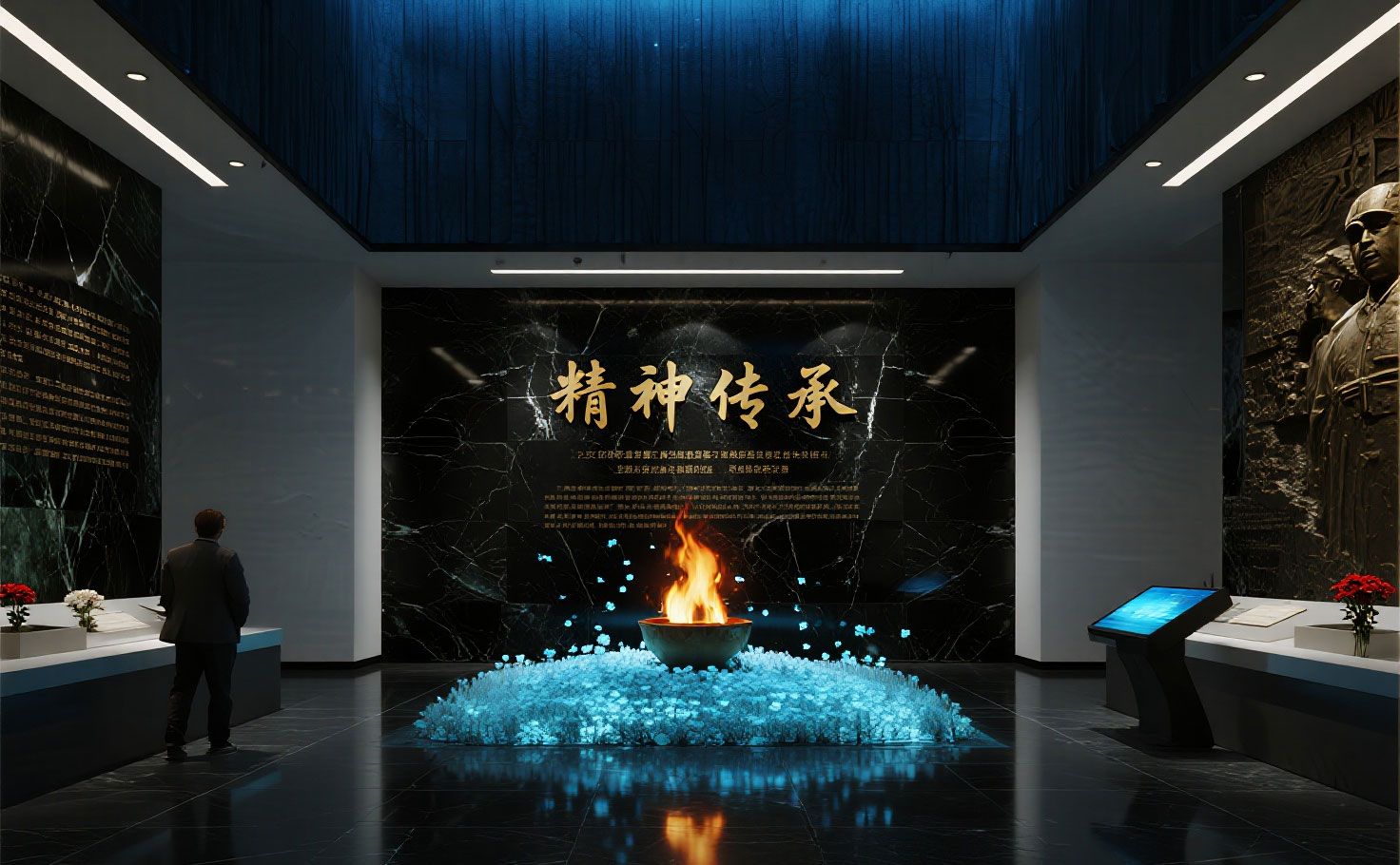 英雄紀念區(qū)是基地中最為莊嚴靜謐的殿堂,旨在永恒傳承英雄精神。設計采用暗色調與點光源照明,營造崇高肅穆氛圍。中心設置象征精神永存的光影永恒之火藝術裝置,周圍陳列英雄群像雕塑。電子英烈名錄墻循環(huán)展示英雄生平,可供觸摸查詢。參觀者可通過互動裝置點亮電子蠟燭、獻花或錄制寄語,表達緬懷敬仰。另設紅色家書閱讀區(qū),供人靜心感受英雄的理想信念。此區(qū)域是進行愛國主義教育與精神洗禮的核心場所。