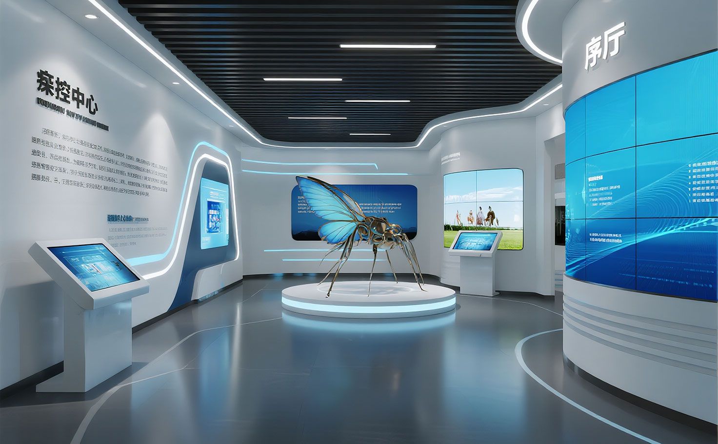 序廳是病媒生物標(biāo)本展示館的印象門戶。入口弧形LED屏循環(huán)播放主題宣傳片,側(cè)面設(shè)置疾控中心互動(dòng)簡(jiǎn)介墻。中央點(diǎn)綴大型藝術(shù)化金屬蚊蟲雕塑,瞬間聚焦視線,彰顯展廳設(shè)計(jì)公司對(duì)空間美學(xué)的精準(zhǔn)把控。