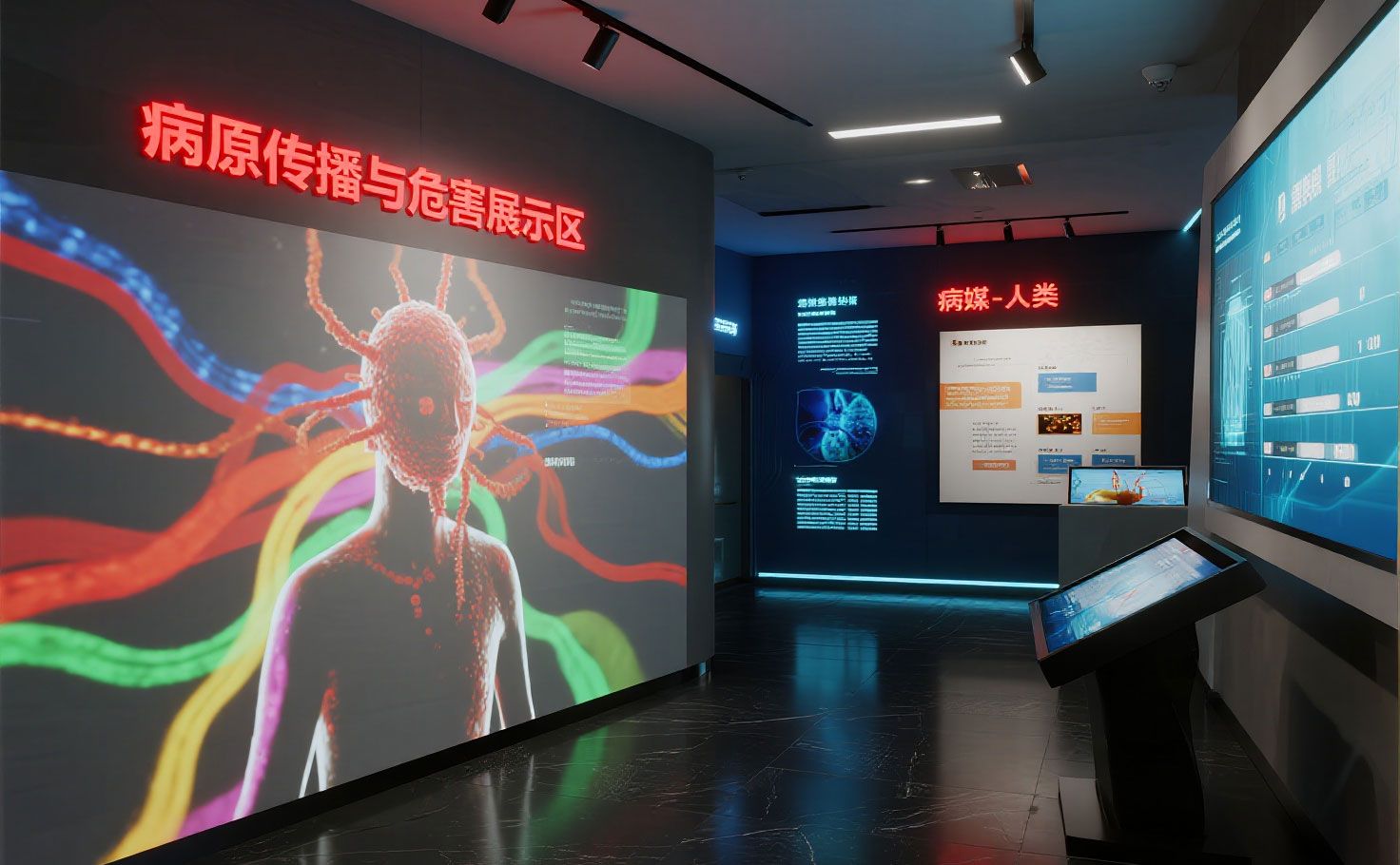 動(dòng)態(tài)壁投清晰呈現(xiàn)病媒傳播登革熱、瘧疾等過程。疫情時(shí)間軸觸摸屏與交互地圖,讓觀眾洞察疾病歷史與地理分布。展廳設(shè)計(jì)公司通過多媒體手段,將復(fù)雜的公共衛(wèi)生威脅轉(zhuǎn)化為直觀的視聽體驗(yàn)。