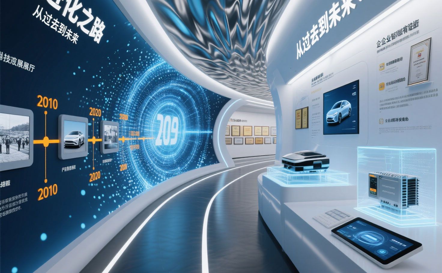 本展區(qū)以“時(shí)空隧道”為造型線索,通過弧形屏與線性燈光引導(dǎo)動(dòng)線,呈現(xiàn)企業(yè)從過去到未來的技術(shù)演進(jìn)。左側(cè)互動(dòng)時(shí)間軸可觸摸查詢關(guān)鍵節(jié)點(diǎn)與突破細(xì)節(jié),右側(cè)陳列里程碑產(chǎn)品實(shí)物及技術(shù)參數(shù)。盡頭設(shè)置動(dòng)態(tài)榮譽(yù)墻,重點(diǎn)獎(jiǎng)項(xiàng)支持交互查看背景信息。整體設(shè)計(jì)凸顯企業(yè)在智能駕駛領(lǐng)域的探索歷程與行業(yè)地位,增強(qiáng)觀眾信任感。
