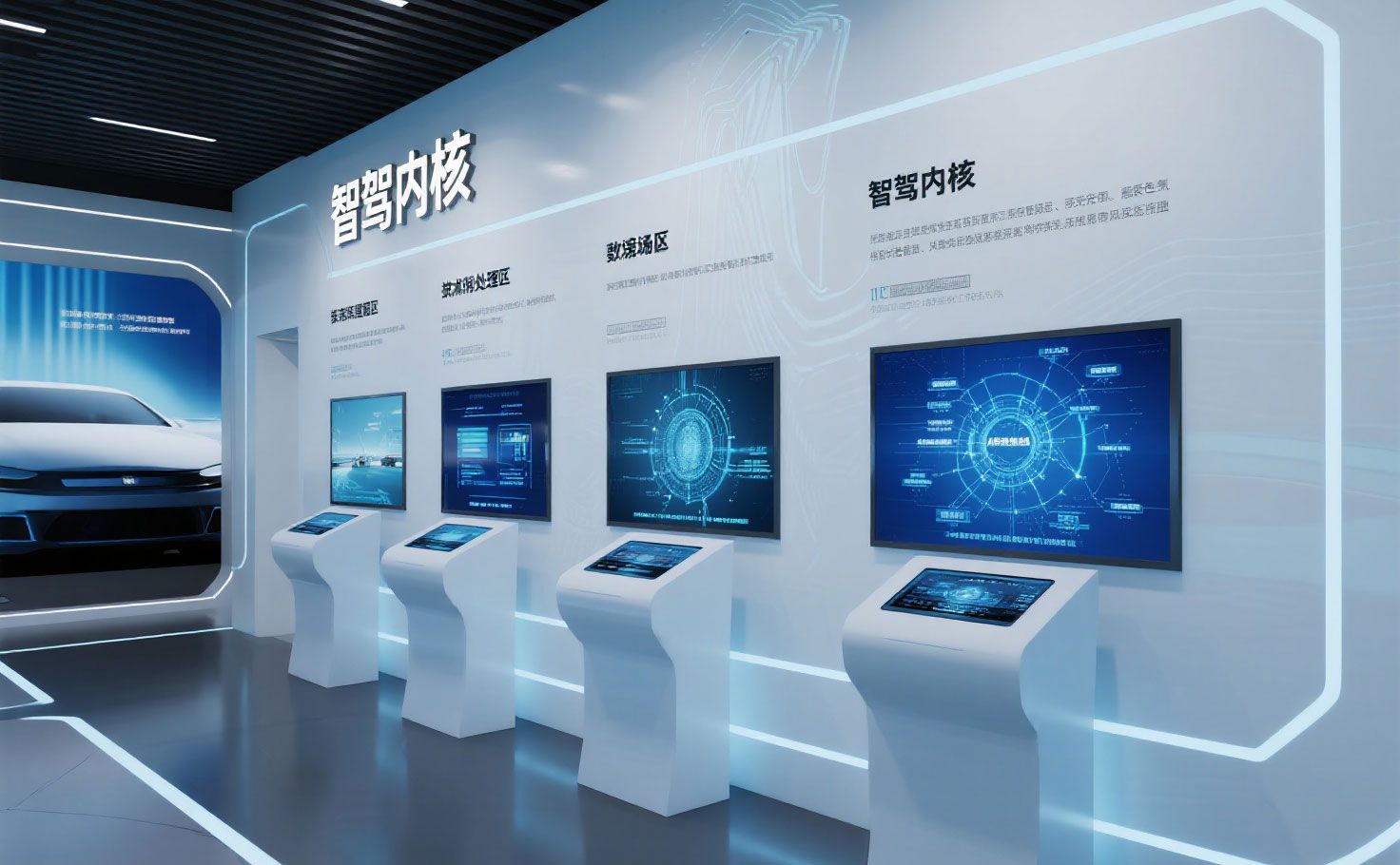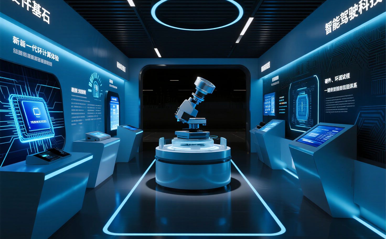 核心硬件區(qū)聚焦企業(yè)自主研發(fā)的關(guān)鍵設(shè)備,彰顯技術(shù)實(shí)力。入口芯片墻通過顯微攝像放大納米級結(jié)構(gòu),中心旋轉(zhuǎn)展臺以爆炸式展示計(jì)算平臺與域控制器,配合燈光解說揭示內(nèi)部構(gòu)造。側(cè)墻設(shè)置硬件在環(huán)測試體驗(yàn)與硬件演進(jìn)走廊,通過數(shù)據(jù)對比凸顯代際性能提升。展廳設(shè)計(jì)公司通過科技化展陳手法,將抽象技術(shù)轉(zhuǎn)化為可感知的實(shí)體體驗(yàn)。