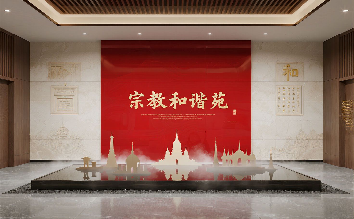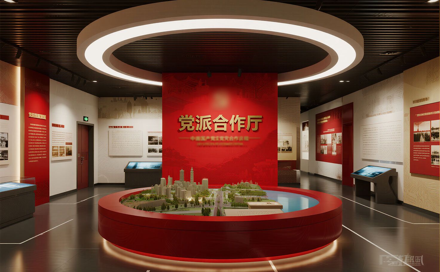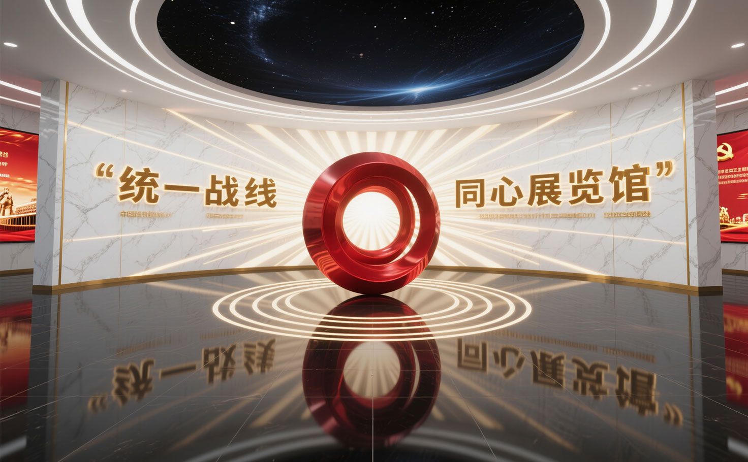 中央設(shè)置象征“大團(tuán)結(jié)大聯(lián)合”的“同心圓”藝術(shù)雕塑,寓意畫好最大同心圓。配合LED弧形巨幕播放《同心共筑中國夢》主題影片,生動呈現(xiàn)統(tǒng)一戰(zhàn)線歷程與成就。宣言墻融合發(fā)光字與觸控感應(yīng)技術(shù),觀眾可聆聽重要講話音頻?;雍灥较到y(tǒng)支持留言并生成電子證書。本廳作為統(tǒng)一展項(xiàng)展廳的核心部分,由專業(yè)展廳設(shè)計(jì)公司整體策劃,凸顯凝聚與共享的主題。