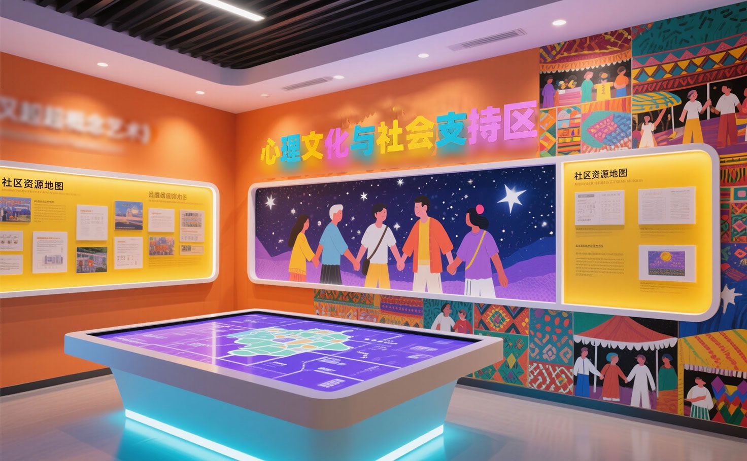 該展區(qū)關(guān)注心理健康的社會文化維度,展示不同文化中的心理支持方式。設(shè)有社區(qū)資源地圖、生命故事分享站及公益項目展臺,提供本地服務(wù)信息與康復(fù)榜樣故事,鼓勵觀眾參與倡導(dǎo)行動。展廳設(shè)計公司通過互動敘事與資源整合,突出心理健康共建共享的理念。