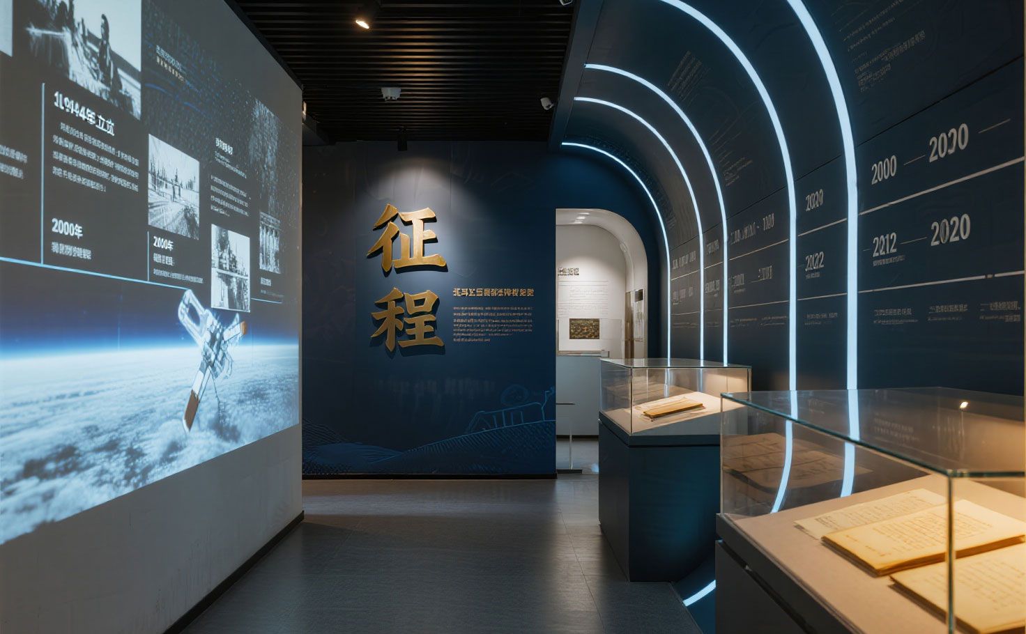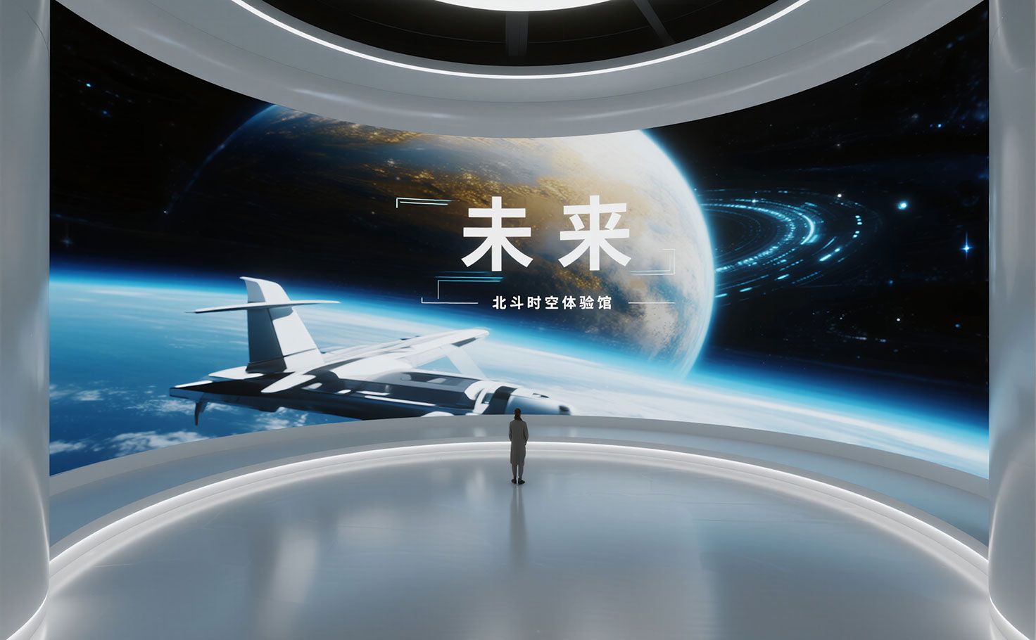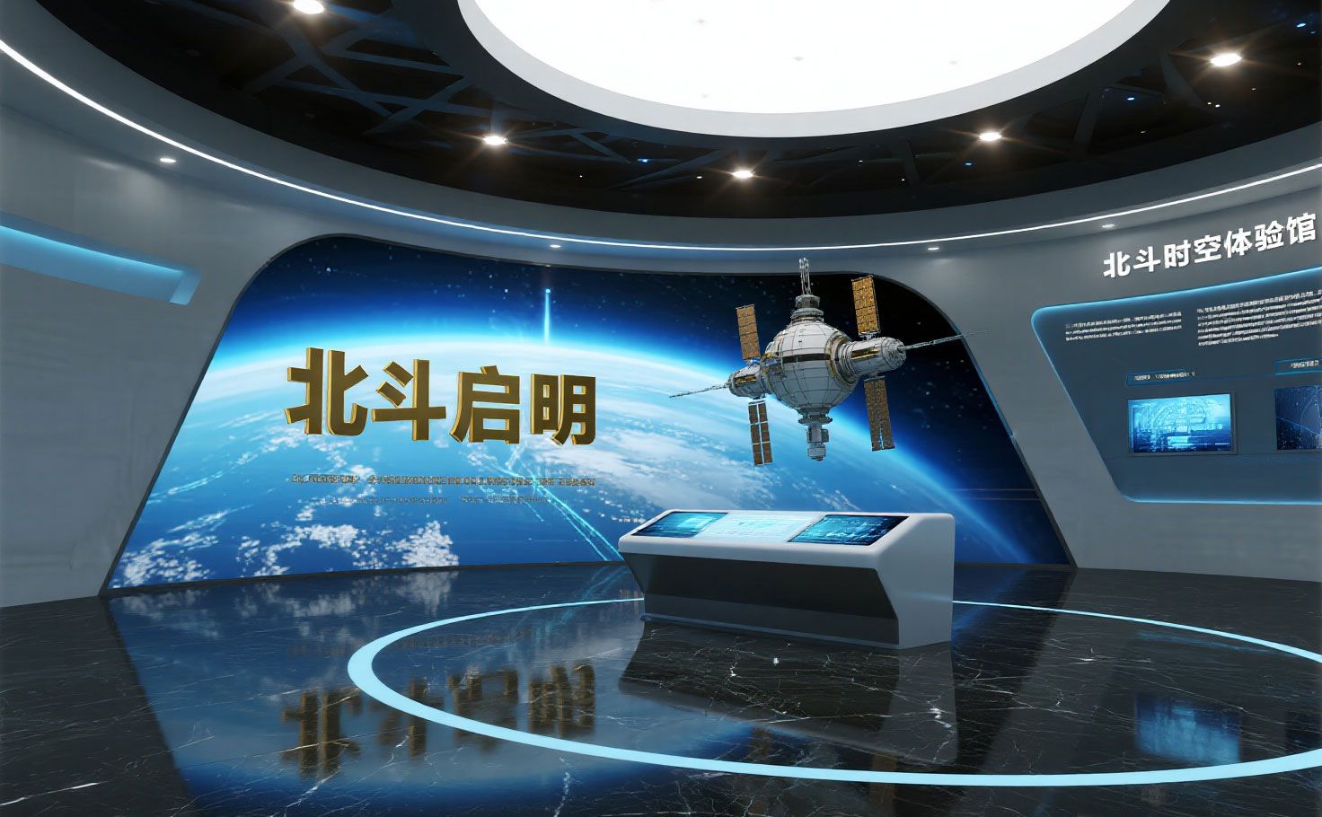 北斗時空體驗館的序廳以“北斗啟明”為主題,通過高空間設計與北斗七星頂飾結合深藍燈光,營造宏偉震撼的宇宙氛圍,彰顯北斗系統(tǒng)的國家戰(zhàn)略價值?;⌒蜭ED影像墻(15米×3米)循環(huán)播放《北斗·全球使命》影片,呈現(xiàn)北斗全球覆蓋與多國應用。中央懸浮1:10北斗三號衛(wèi)星模型,以磁懸浮科技增強視覺沖擊。文化意象裝置藝術化演繹古代導航智慧,互動簽到臺生成觀眾專屬“北斗旅程卡”,關聯(lián)個人參觀數(shù)據(jù),開啟沉浸式北斗之旅。