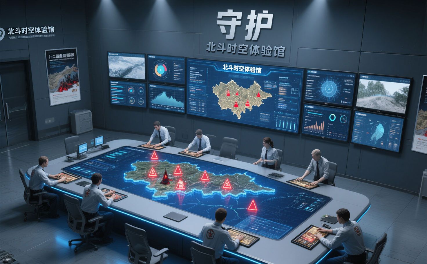 指揮中心風格空間凸顯北斗在防災減災與公共安全中的專業(yè)作用。災害監(jiān)測案例墻多媒體展示預警應用,應急指揮互動桌模擬調度流程。實物展示消防救援與定位裝備,知識問答系統(tǒng)普及防災常識。觀眾通過案例與互動理解北斗的守護價值,體驗科技如何助力安全決策。
