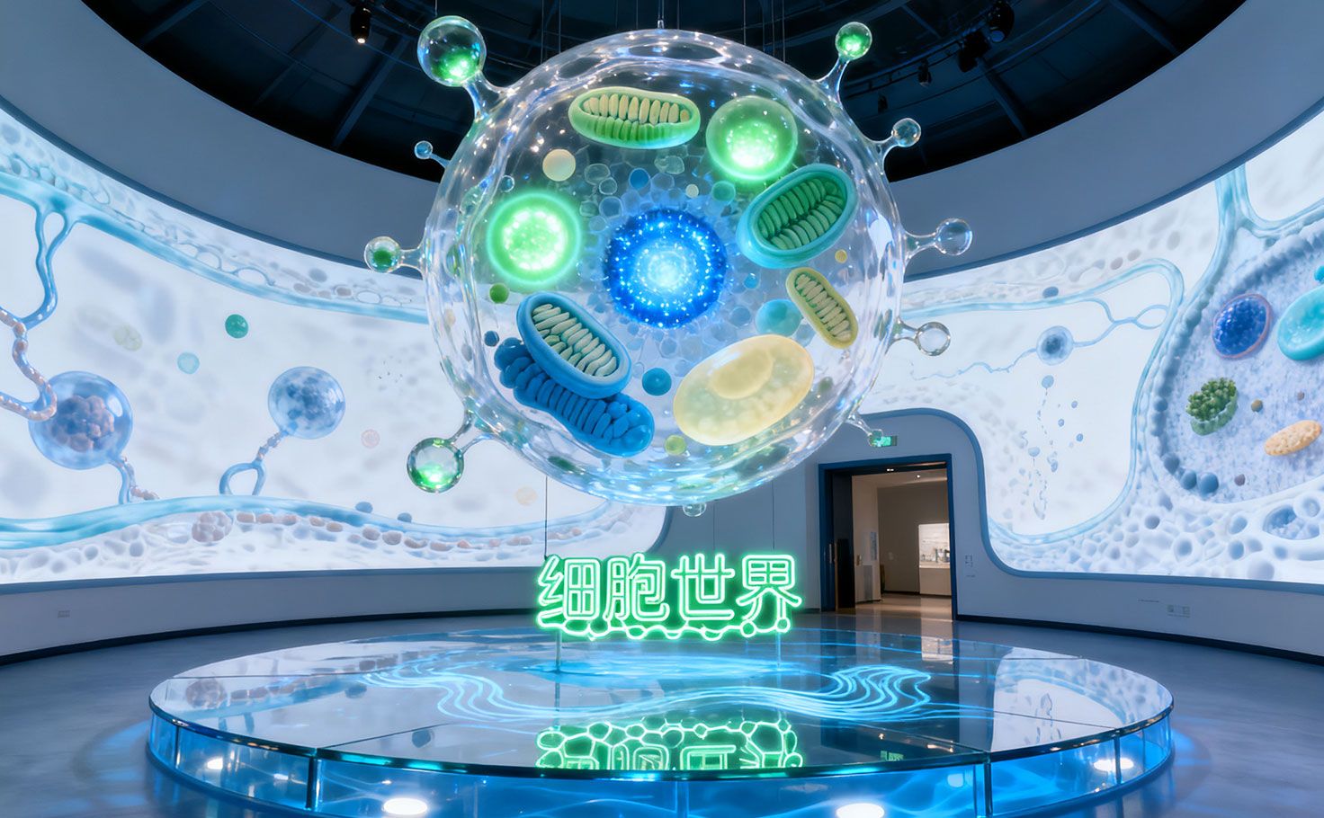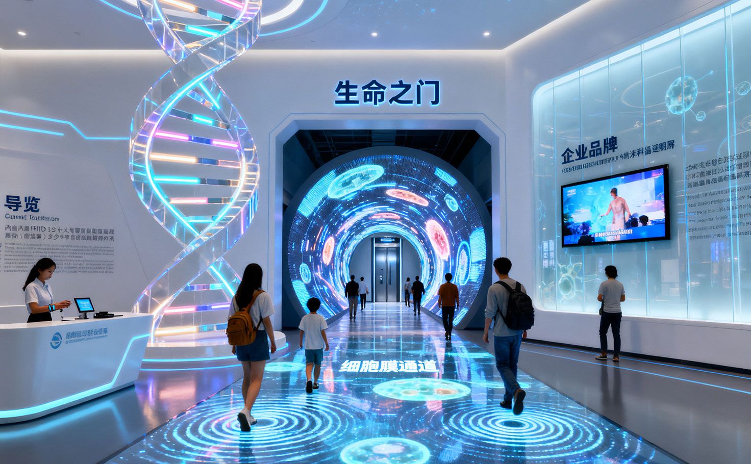 序廳以“生命之門”為主題,營造科技與生命交融的初印象。入口設(shè)置6米高雙螺旋藝術(shù)裝置,結(jié)合亞克力與LED燈帶,動態(tài)模擬DNA結(jié)構(gòu)。地面配備互動地屏,腳步觸發(fā)漣漪效果,隱喻細(xì)胞能量傳遞。右側(cè)企業(yè)品牌墻選用納米液晶透明屏,常態(tài)半透明,播放時高清展示。左側(cè)導(dǎo)覽臺提供智能手環(huán),依身份自動調(diào)整講解內(nèi)容。中心時空隧道借柔性LED屏呈現(xiàn)細(xì)胞生命周期,盡頭以“細(xì)胞膜通道”電梯引導(dǎo)觀眾進入微觀世界,完成這座生物細(xì)胞科普館的首段沉浸體驗。