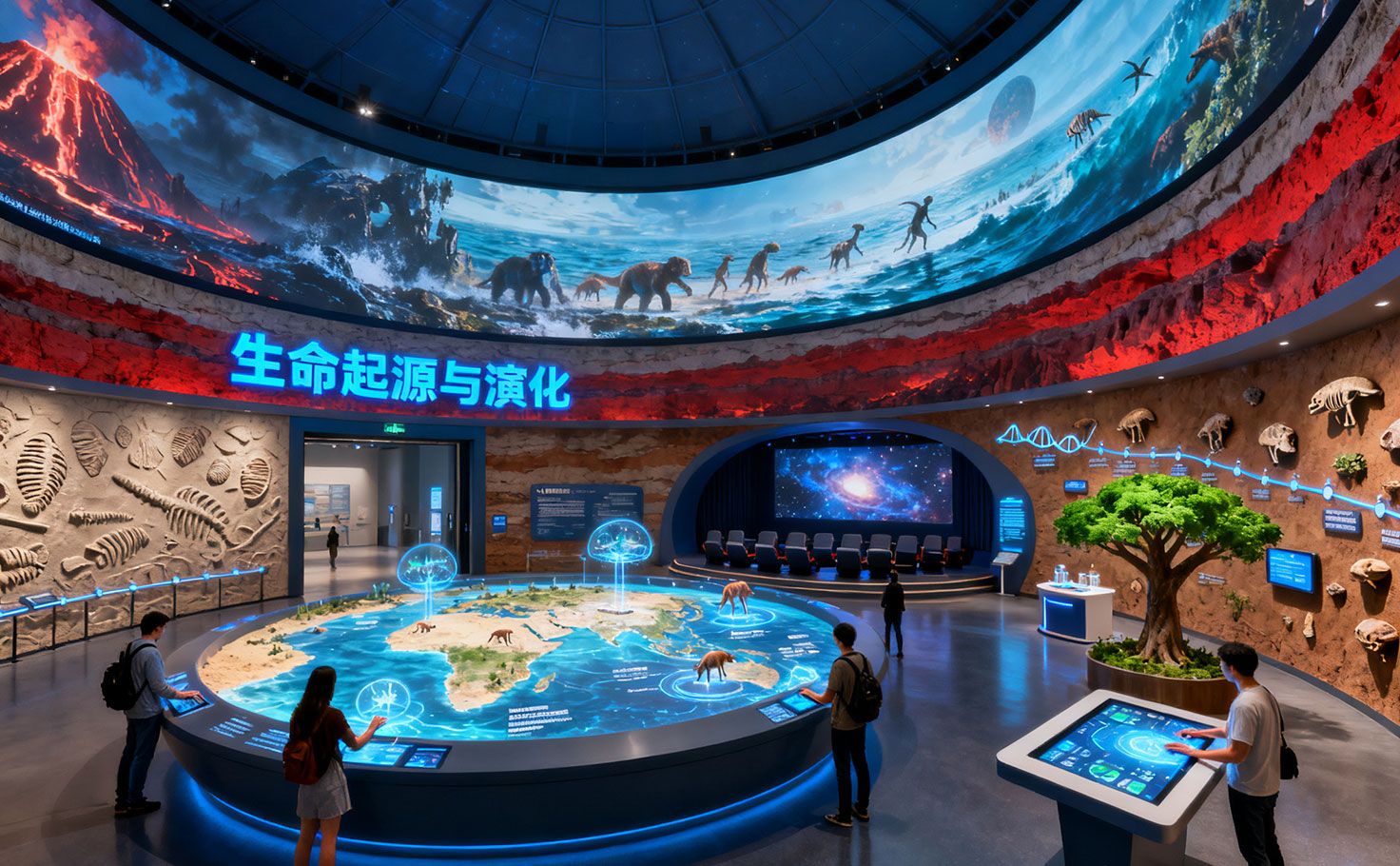 本區(qū)以“億萬年生命之旅”為線索,融合多媒體與實物標(biāo)本闡述演化歷程。入口設(shè)置可降解時間軸展墻,展后轉(zhuǎn)為種植容器傳遞環(huán)保理念。核心為360°環(huán)幕影院,播放8分鐘“生命奇跡”影片,配合環(huán)繞聲與震動座椅營造沉浸觀感。外圍互動化石墻嵌有高精度模型,觸控可激活3D生物全息解說。進化樹互動桌支持手勢探索物種親緣,DNA提取站則模擬古遺傳學(xué)研究過程,展現(xiàn)展廳設(shè)計公司對科普敘事與科技融合的專業(yè)能力。