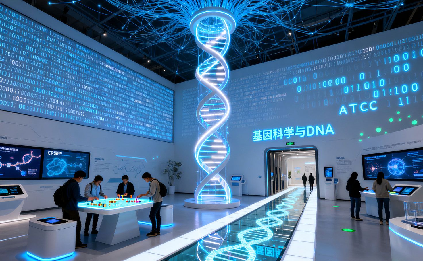 本區(qū)聚焦遺傳機制,以互動方式解密生命密碼。入口DNA螺旋步道以光影呈現(xiàn)基因鏈動態(tài),兩側(cè)屏幕播放CRISPR等技動畫面。中心設(shè)4.5米高LED雙螺旋結(jié)構(gòu),演示復(fù)制、轉(zhuǎn)錄與翻譯過程?;虮硇突友b置可觀察變異對性狀的影響。左側(cè)AR基因編輯實驗室模擬分子剪刀操作,右側(cè)AI問答墻提供個性化解答,倫理辯論區(qū)則借助AI生成未來社會圖景,引導(dǎo)觀眾思考科技邊界。