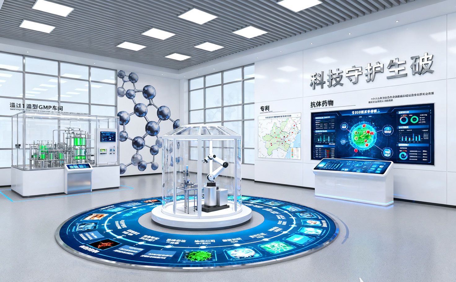 本區(qū)突出企業(yè)在生物醫(yī)藥領(lǐng)域的創(chuàng)新,以“科技守護生命”為主題。中心環(huán)形LED屏呈現(xiàn)藥物研發(fā)時間樹,標(biāo)注關(guān)鍵節(jié)點與企業(yè)貢獻。左側(cè)1:1還原GMP車間模型,結(jié)合傳感裝置展示環(huán)境對生產(chǎn)的影響。右側(cè)全息成像動態(tài)演示抗體藥物與腫瘤細(xì)胞相互作用,臨床試驗數(shù)據(jù)地圖實時更新全球研究進展。整體通過實物、模型與數(shù)據(jù)的多層次展示,體現(xiàn)展廳設(shè)計公司在內(nèi)容視覺化與體驗設(shè)計上的綜合能力。