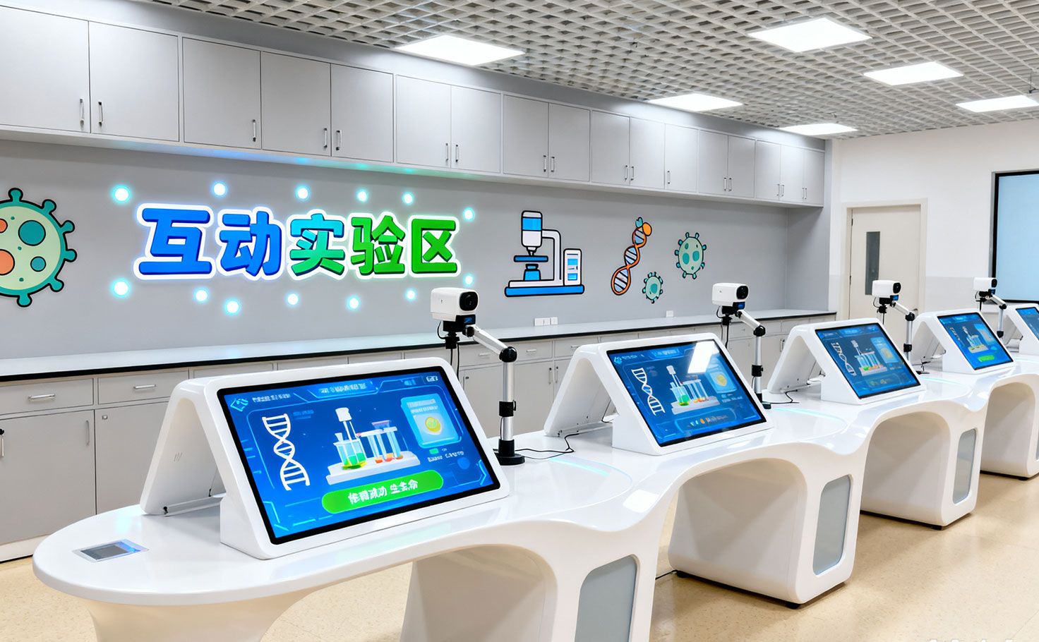 互動實驗區(qū)提供安全有趣的實驗體驗,涵蓋DNA提取、細(xì)胞染色等基礎(chǔ)操作。6組模擬實驗臺配備觸摸屏與動作捕捉系統(tǒng),引導(dǎo)觀眾完成虛擬流程。大型交互墻輔助團隊教學(xué),細(xì)胞分離裝置支持手勢調(diào)控參數(shù),顯微鏡觀察站結(jié)合AR標(biāo)注真實細(xì)胞結(jié)構(gòu)。內(nèi)側(cè)生物安全體驗艙模擬高等級實驗室環(huán)境,培養(yǎng)安全操作意識。電子記錄系統(tǒng)通過手環(huán)生成實驗報告,強化科普收獲,展現(xiàn)生物細(xì)胞科普館的教育實踐理念。