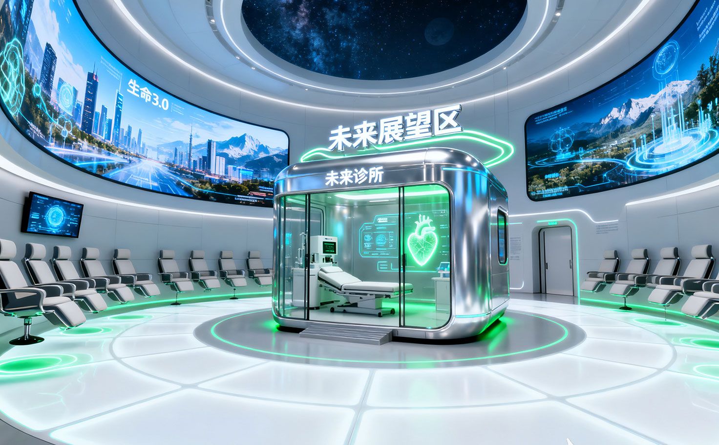 未來展望區(qū)以“生命3.0”為主題,探索生物醫(yī)藥未來方向與社會影響。中心環(huán)形劇場播放8K影片《生命3.0》,融合全息與懸浮座椅打造沉浸觀影。左側(cè)未來診所體驗艙模擬AI診斷、3D打印器官及納米治療流程,觀眾可生成健康預(yù)測。右側(cè)倫理思辨區(qū)通過交互屏幕引導(dǎo)探討科技與人文的平衡。“未來明信片”裝置生成科藝融合留念,呼應(yīng)展館對創(chuàng)新與思考并重的設(shè)計愿景。